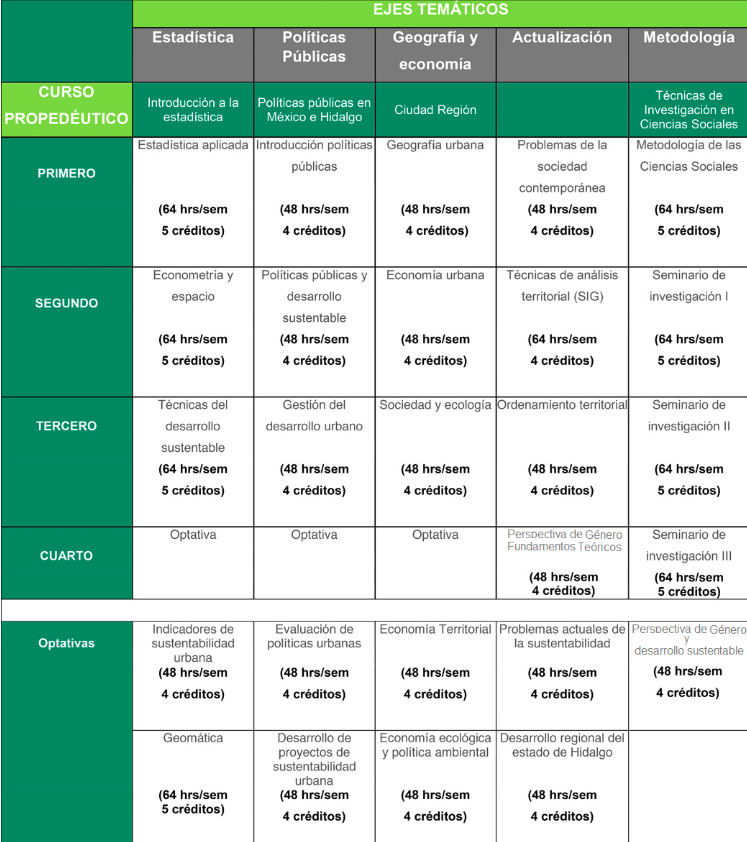 - Análisis de políticas y problemáticas complejas (procesos de urbanización, metropolización, migración, movilidad, entre otros) desde el conocimiento y comprensión de las principales teorías y paradigmas contemporáneos del desarrollo urbano y la sustentabilidad.