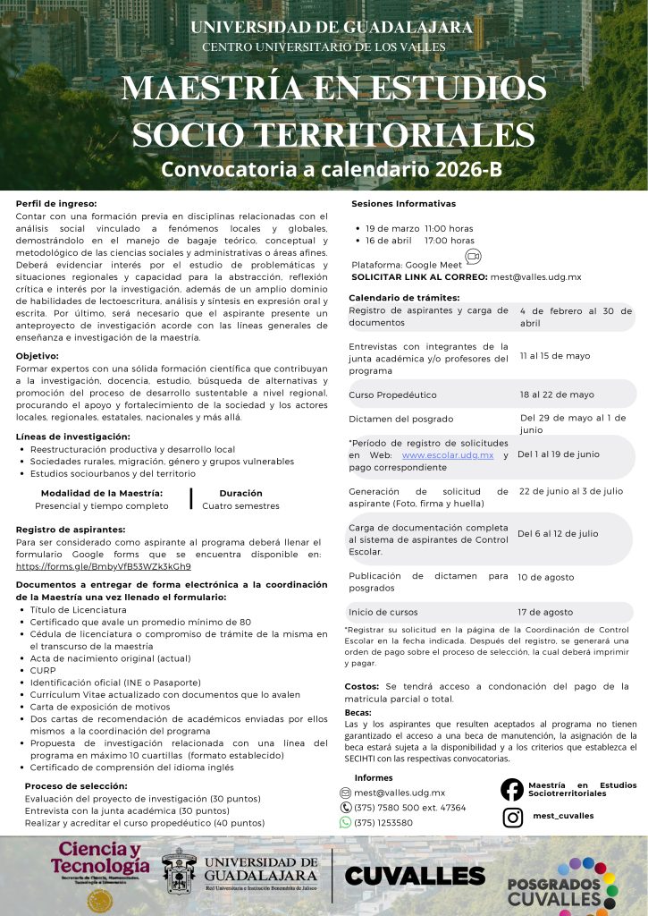 Convocatoria para el ingreso 2026 B del Programa de Maestría en Estudios Socioterritoriales del Centro universitario de los Valles de la Universidad de Guadalajara, programa reconocido por el Sistema Nacional de Posgrados.